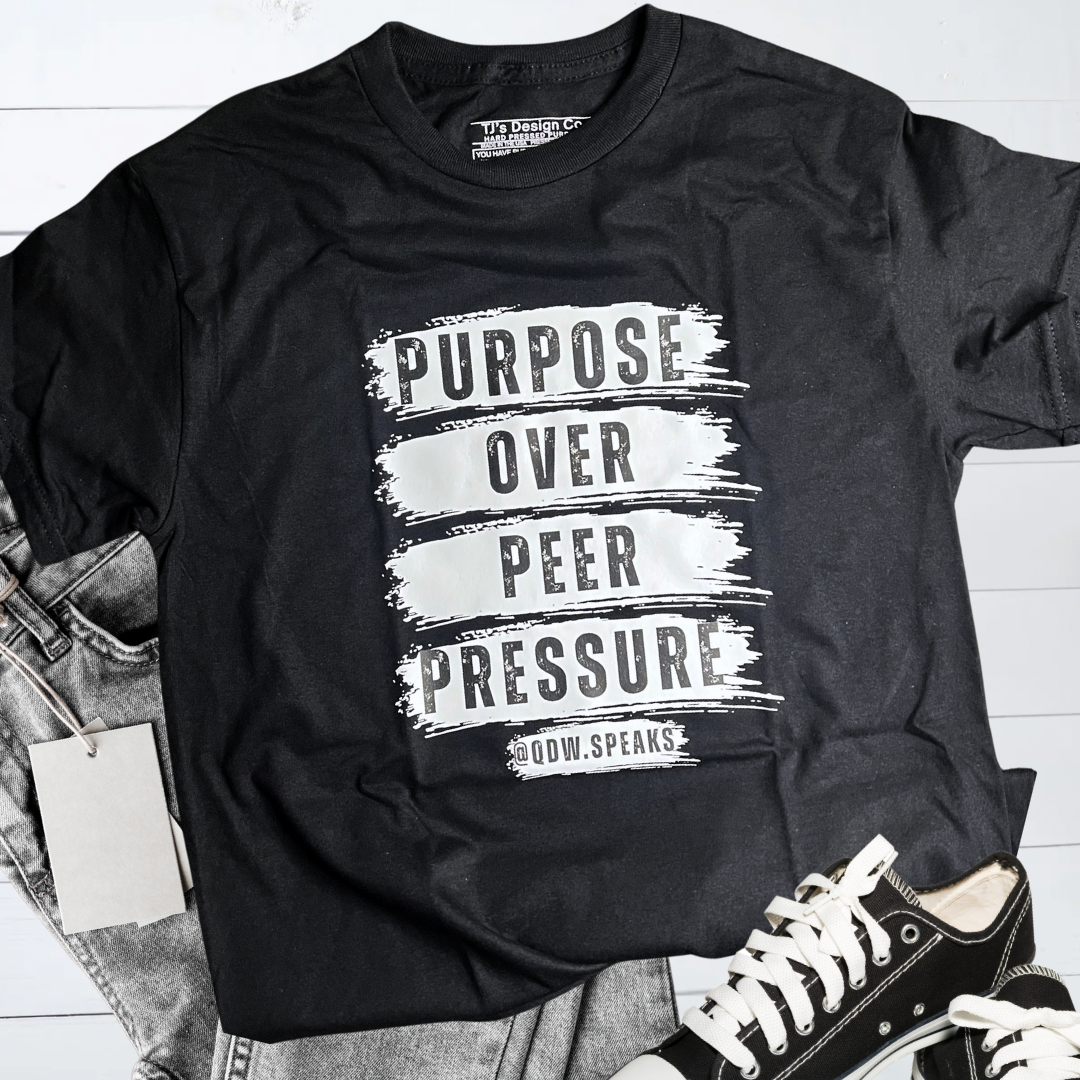 Elevate your wardrobe with the "Purpose Over Peer Pressure" T-shirt by TJ’s Design Co. made for Quentin D. Washington @qdw.speaks merch! —a declaration of confidence and resilience. This black tee features striking white text in a distressed brushstroke style, boldly presenting the powerful message: "PURPOSE OVER PEER PRESSURE." Designed in collaboration with Quentin D. Washington (@QDW.SPEAKS), this shirt reflects the mission to inspire youth and embrace values that drive positive change.